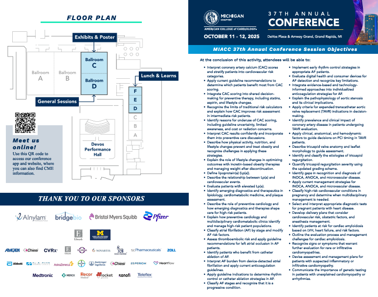 Join us on October 11-12, 2025, at the DeVos Place & Amway Grand in Grand Rapids, MI for the Michigan Chapter of the American College of Cardiology's 37th Annual Conference. This premier event offers a unique opportunity to network with fellow cardiology professionals from across the state while exploring the latest advancements in cardiovascular medicine.